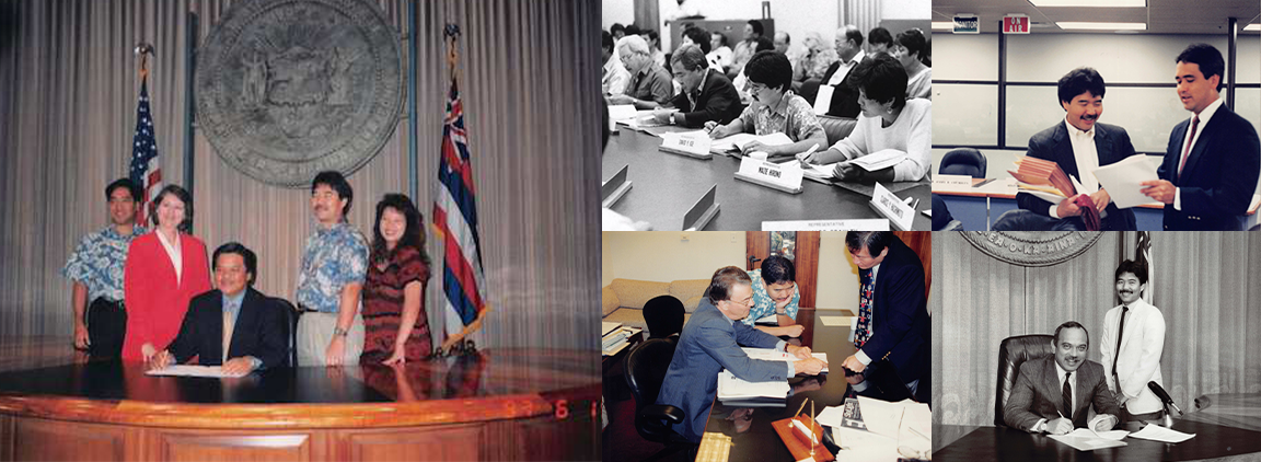 During his time as a representative, he supported public Hawaiian language immersion schools, with Waiau Elementary School in his district becoming one of the first. His legislative efforts focused on public education reform, charter schools, information technology, and telecommunications policy. He co-authored the Hawai‘i Telecommunications and Information Industries Act, which established the state information network and created the Hawai‘i Information Network Corporation. He also worked on diversifying Hawai‘i's economy, establishing seed capital and venture capital programs, software development initiatives, and technology transfer programs. Ige was part of the inaugural 1997 class of the Pacific Century Fellows. He is also considered a co-founder of the Hawai‘i State Legislature's website, alongside Sen. Les Ihara, Jr. and Sen. Carol Fukunaga, for his role in establishing online access to legislative information.